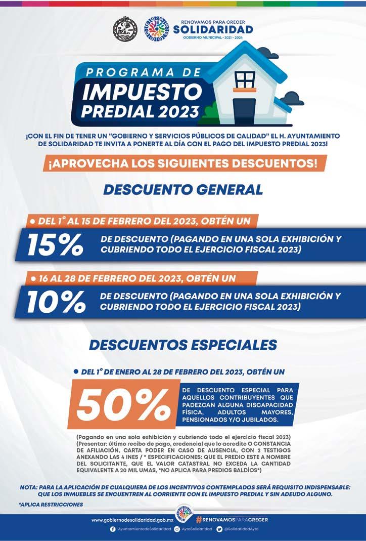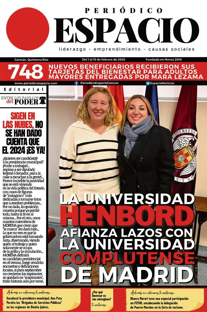 PERIÓDICO ESPACIO DE QUINTANA ROO, periódico quincenal octubre de 2022. Número de Certificado de Reserva otorgado por el Instituto Nacional del Derecho de Autor: 04-2016-040119073000-101. Número de Certificado de Licitud de Título:16745. Número de Certificado de Licitud de Contenido. 16745. Domicilio de la Publicación: Av. Tankah Mz. 1 lote 68 S.M.24 Cancún, Quintana Roo, Municipio Benito Juárez C.P.77509. Nombre y domicilio Imprenta: Compañía Tipográfica Yucateca S.A. de C.V., Calle 60, No.521, Col. Centro, Mérida, Yucatán, C.P. 97000.
