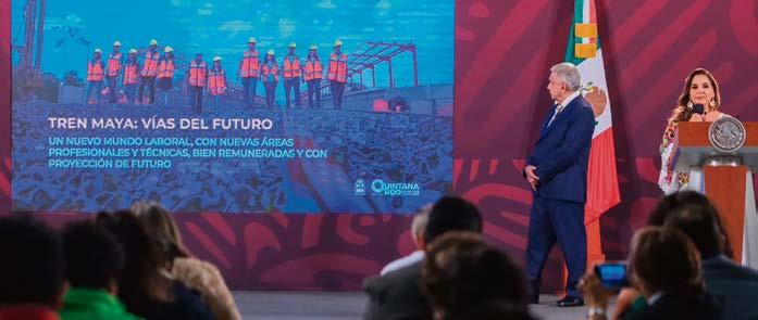 En la máxima tribuna informativa del país, a donde acudió nuevamente invitada para hablar de los avances del Tren Maya y anunciar el arranque de carreras técnicas y estudios profesionales en sistemas ferroviarios en su entidad, la mandataria lució -y presumió- un hermoso atuendo, casi una obra de arte, elaborado por manos de artesanas de la Zona Maya quintanarroense.