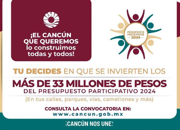 PERIÓDICO ESPACIO DE QUINTANA ROO, periódico quincenal Marzo 2024. Número de Certificado de Reserva otorgado por el Instituto Nacional del Derecho de Autor: 04-2016-040119073000-101. Número de Certificado de Licitud de Título:16745. Número de Certificado de Licitud de Contenido. 16745. Domicilio de la Publicación: Av. Tankah Mz. 1 lote 68 S.M.24 Cancún, Quintana Roo, Municipio Benito Juárez C.P.77509. Nombre y domicilio Imprenta: Compañía Tipográfica Yucateca S.A. de C.V., Calle 60, No.521, Col. Centro, Mérida, Yucatán, C.P. 97000.