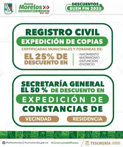 La Presidenta Municipal dijo que también se pueden obtener descuentos por la expedición de constancias de residencia y vecindad que extiende la Secretaría General, al igual que en multas de tránsito, excepto las impuestas por conducir bajo la influencia del alcohol o por accidentes, además de la expedición de copias certificadas municipales y foráneas de actas de nacimiento, matrimonio, defunción y divorcio solicitadas al Registro Civil.