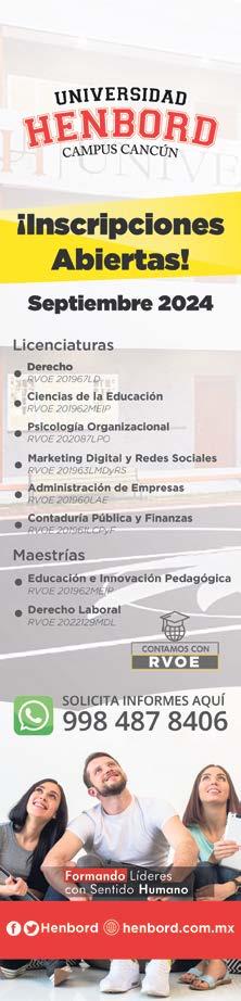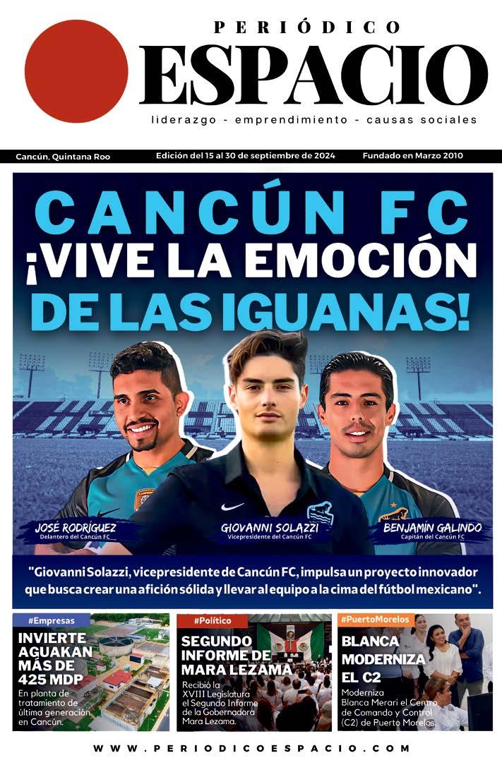 PERIÓDICO ESPACIO DE QUINTANA ROO, periódico quincenal Marzo 2024. Número de Certificado de Reserva otorgado por el Instituto Nacional del Derecho de Autor: 04-2016-040119073000-101. Número de Certificado de Licitud de Título:16745. Número de Certificado de Licitud de Contenido. 16745. Domicilio de la Publicación: Av. Tankah Mz. 1 lote 68 S.M.24 Cancún, Quintana Roo, Municipio Benito Juárez C.P.77509. Nombre y domicilio Imprenta: Compañía Tipográfica Yucateca S.A. de C.V., Calle 60, No.521, Col. Centro, Mérida, Yucatán, C.P. 97000.