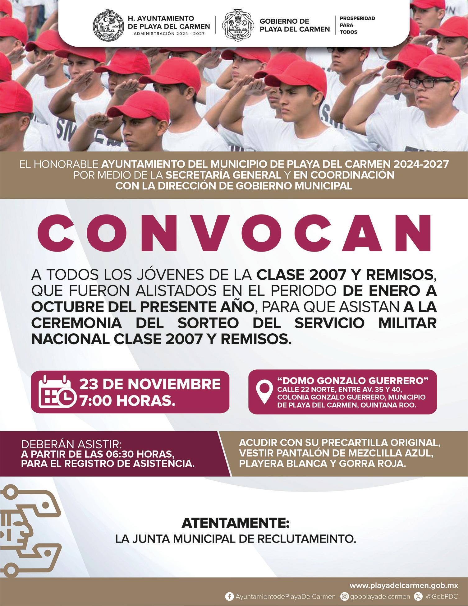 LCozumel. La Secretaría de la Defensa Nacional invita a participar en el Sorteo del Servicio Militar Nacional los domingos 23 y 30 de noviembre en las oficinas de Reclutamiento. Requisito: Cartilla de Identidad del Servicio Militar.