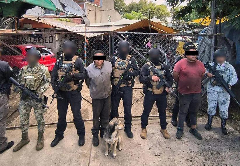 Durante la diligencia, se aseguraron un fragmento metálico con número de serie, dos placas de circulación del Estado de México, dos espejos retrovisores y un arma corta con 15 cartuchos útiles. Asimismo, fueron detenidos dos hombres de 28 y 53 años de edad.