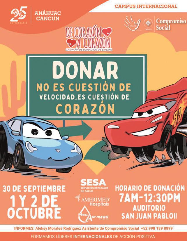 Con el lema “Donar sangre es donar vida”, la Universidad Anáhuac Cancún lleva a cabo la campaña de donación de sangre “De corazón a corazón”, del 30 de septiembre al 2 de octubre, en el auditorio San Juan Pablo II, en un horario de 7 de la mañana a 12:30 del día, anunció la gobernadora Mara Lezama Espinosa.