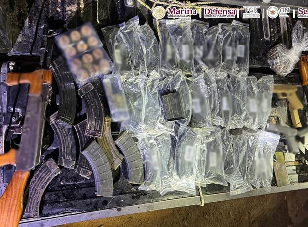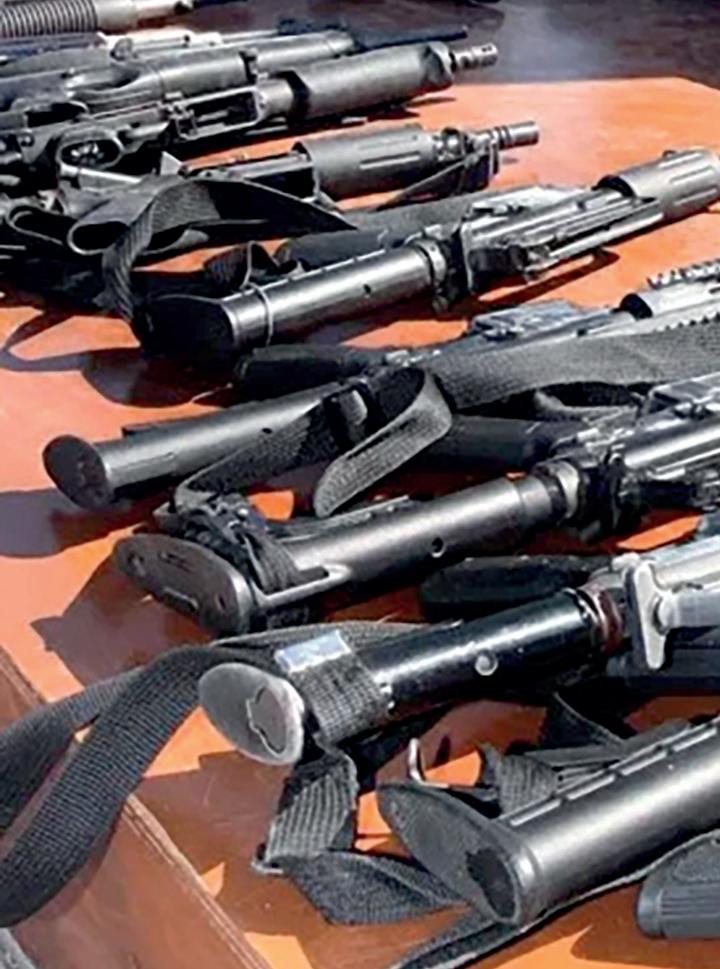 › Se aseguraron tres armas cortas, dos armas largas, cargadores, cartuchos útiles, 18 frascos con marihuana, una bolsa con cristal y una camioneta.