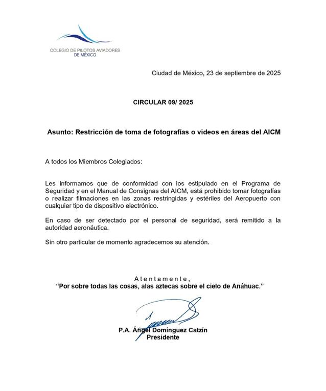 La confusión surgió luego de que la semana pasada el Colegio de Pilotos emitiera la circular 9/2025, en la que se señaló que “de conformidad con lo estipulado en el Programa de Seguridad y en el Manual de Consignas del AICM, está prohibido tomar fotografías o realizar filmaciones en zonas restringidas del aeropuerto con cualquier dispositivo electrónico. En caso de ser detectado por el personal de seguridad, será remitido a la autoridad aeronáutica”.