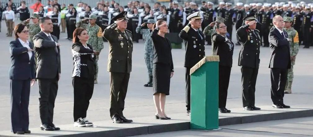 pañada de la jefa de Gobierno de la Ciudad de México, Clara Brugada, fue escoltada por el secretario de la Defensa Nacional, Ricardo Trevilla; de Marina, Raymundo Morales; de Gobernación, Rosa Icela Rodríguez, de Seguridad y Protección Ciudadana, Omar García Harfuch. A las 7:19 comenzó el izamiento del lábaro patrio.