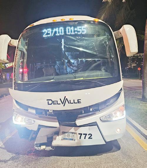 Un conductor de un autobús de la empresa Del Valle que circulaba por el bulevar Kukulkán, frente al kilómetro 14.5, frente al restaurante Bombay en dirección de Norte a Sur, no guardó la distancia de seguridad respecto al vehículo que le precedía, chocando por alcance al vehículo Chevrolet tipo Aveo que circulaba sobre la misma vía y dirección.