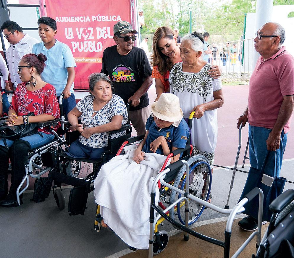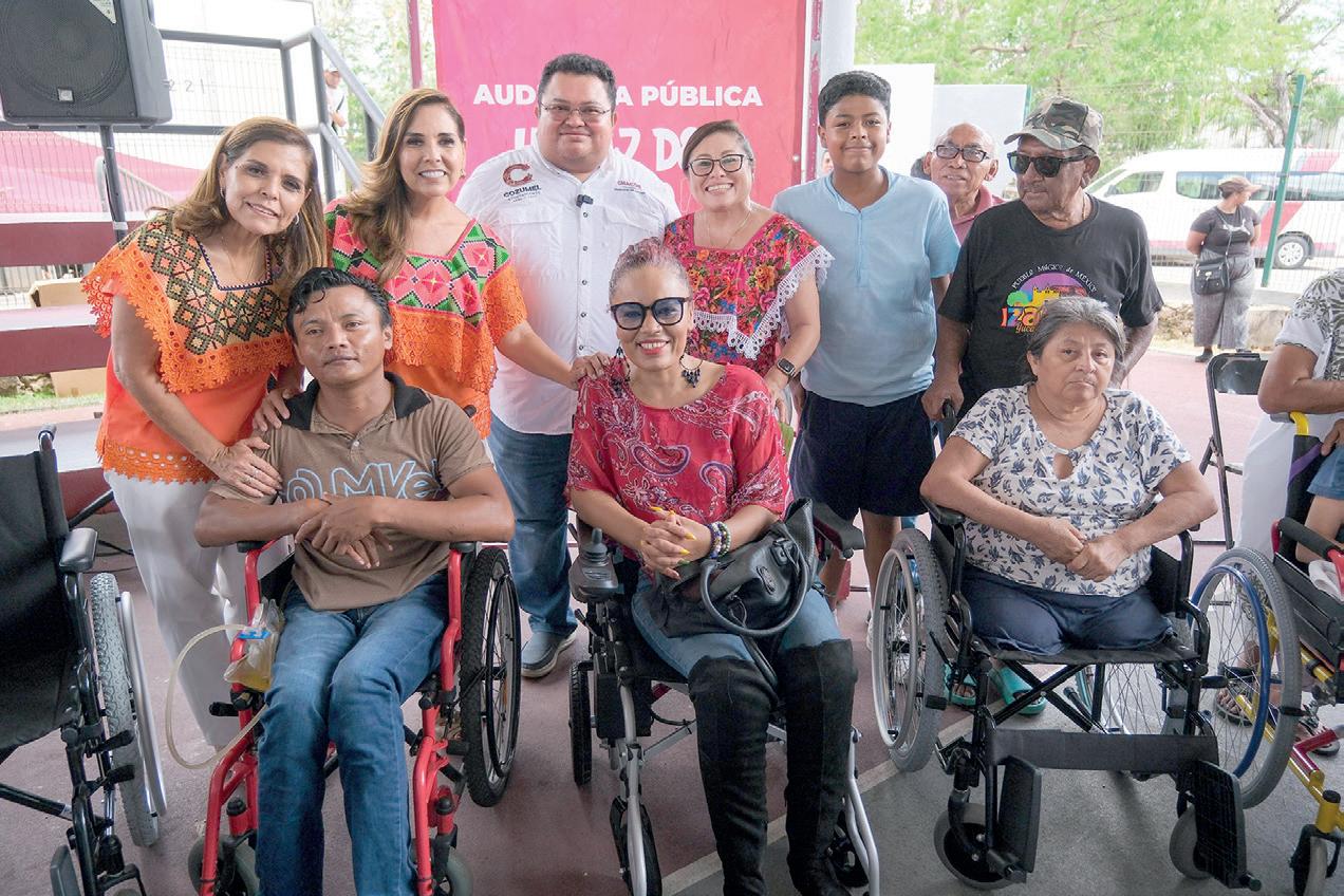 ACOMPAÑADA POR VERÓNICA LEZAMA Y EL EDIL JOSÉ LUIS CHACÓN, la mandataria estatal entregó sillas de ruedas estándar y una eléctrica, entre otros aditamentos.