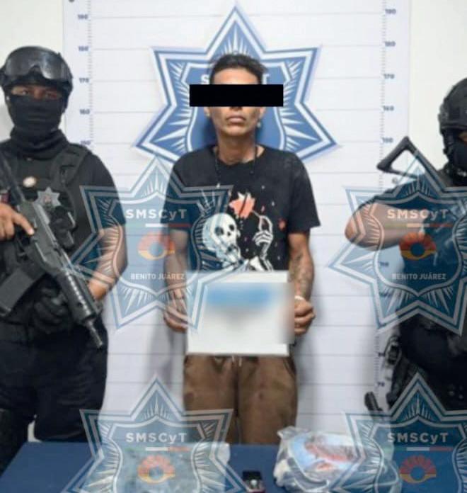 La detención se realizó cuando los elementos policiales, que realizaban recorridos de vigilancia en la Supermanzana 208, se percataron de un masculino junto a una motocicleta Italika FT125, color blanco con negro, quien manipulaba unas bolsitas con hierba verde y seca con las características de la marihuana.