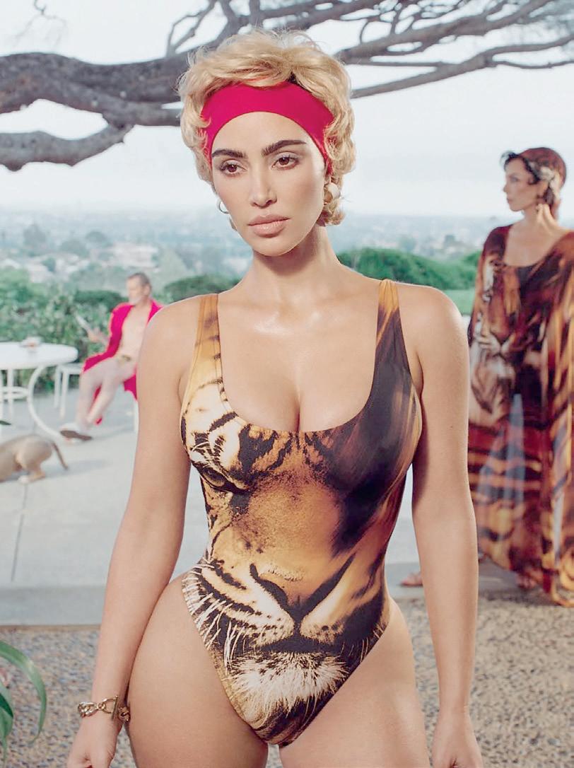 Luce bikini “animal print” y presenta la nueva colección de trajes de baño de su marca “Skims”.