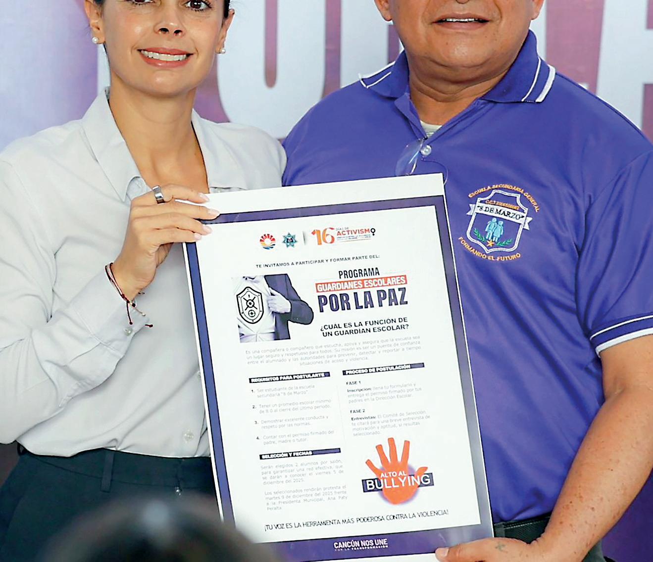 Como parte de la Campaña de 16 días de Activismo contra la Violencia de Género, la presidenta municipal, Ana Paty Peralta, presentó el programa “Guardianes Escolares por la Paz”, para que los alumnos de secundaria entre 12 y