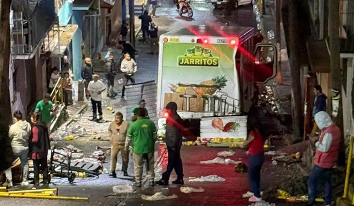 Accidente. En la conocida “Bajada del terror” de la Alcaldía Álvaro Obregón, un camión refresquero perdió el control impactando fachadas y todo a su paso. Dos personas adultas mayores resultaron con crisis nerviosa. OPERATIVO