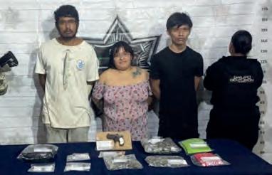 ya del Carmen, en donde se realizó la inspección correspondiente a Wendy Margarita “N”, Cristian Humberto “N” e Isaí “N”. Se les decomisaron: 110 bolsitas de plástico trasparentes tipo ziploc con vegetal de color verde, con las características similares a la marihuana; 52 bolsitas transparentes con fragmentos cristalinos con características al cristal, un arma tipo escuadra de color negro con blanco marca “Mendoza” calibre 4.5 /.177, un cartucho de color dorado calibre 22., dos bolsas ecológicas y una mariconera.