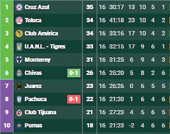 En zona de Play-In se encuentran los Bravos de Juárez, el Pachuca, los Xolos de Tijuana y los Pumas de Efraín Juárez con 18 puntos, que este domingo firmaron una goleada que sirve como oro puro para los universitarios en sus aspiraciones de meterse a la fase final.