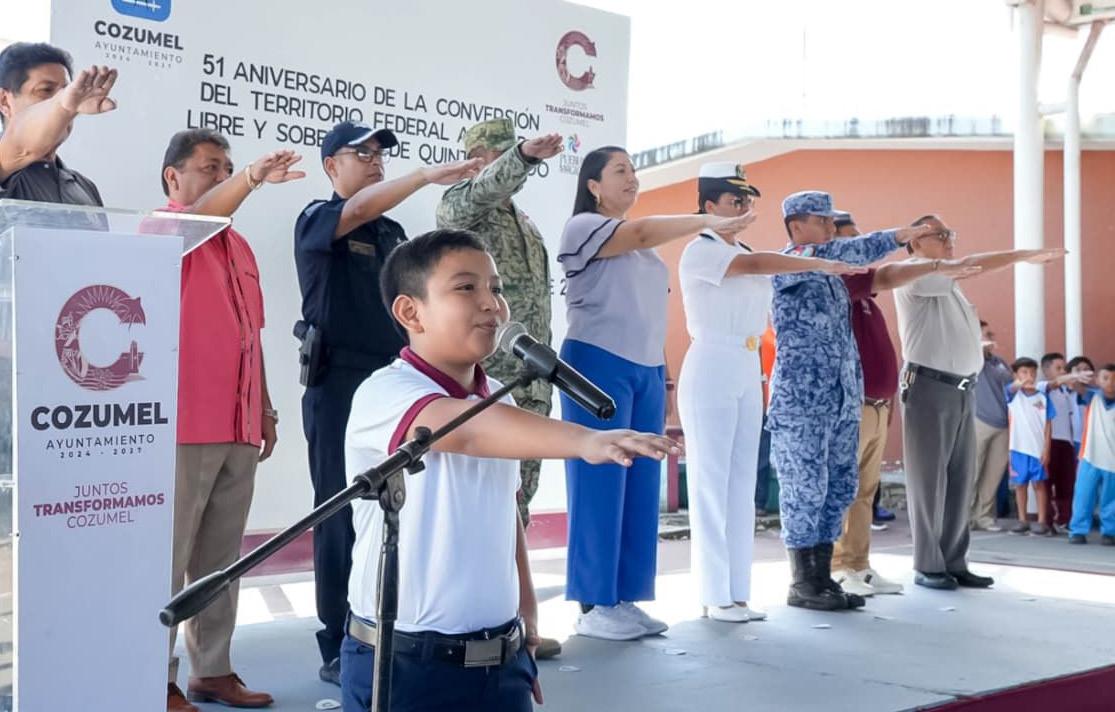 La gobernadora Mara Lezama Espinosa encabezó la ceremonia de izamiento de la bandera de Quintana Roo en ocasión del 51 aniversario de su creación como Estado Libre y Soberano, evento en el que se estrenó la Banda de Guerra Monumental de más de 112 elementos, niños y jóvenes, así como las escoltas de Bandera Nacional y Estatal que se integra con ocho organizaciones cívicas libres y planteles educativos.