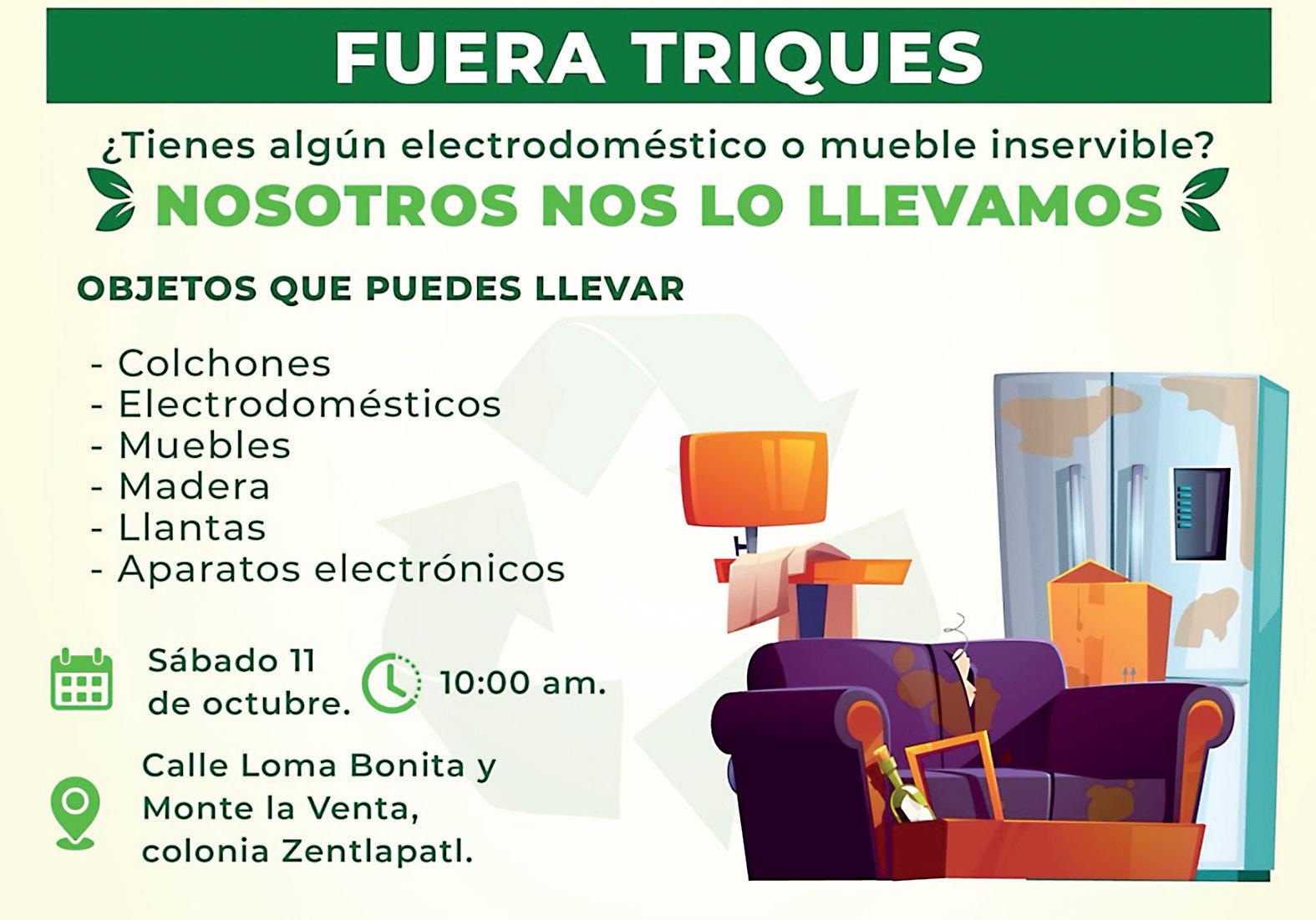 Salubridad. Porque mantener limpia nuestra alcaldía empieza desde casa. Participa en la jornada Fuera Triques y deja que nos encarguemos de lo que ya no necesitas, juntos cuidamos el medio ambiente.