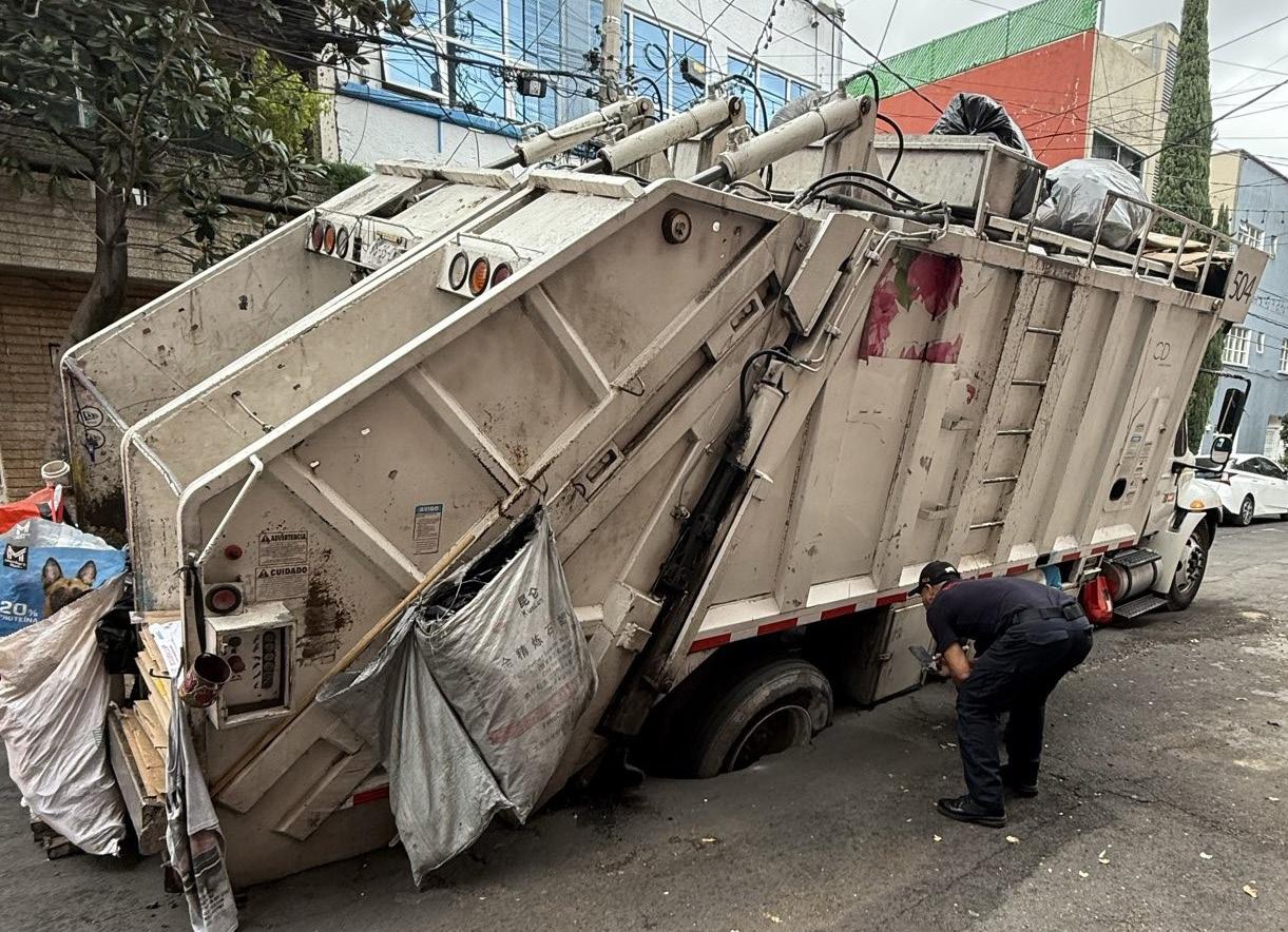 Un nuevo socavón sorprendió la mañana del miércoles a los habitantes de la colonia Vista Alegre, en la Alcaldía Cuauhtémoc, cuando un camión recolector de basura de la demarcación cayó parcialmente al colapsar el asfalto bajo una de sus llantas traseras.