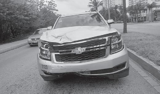 › La camioneta Suburban solo resultó un poco abollada en la parte delantera de la unidad.