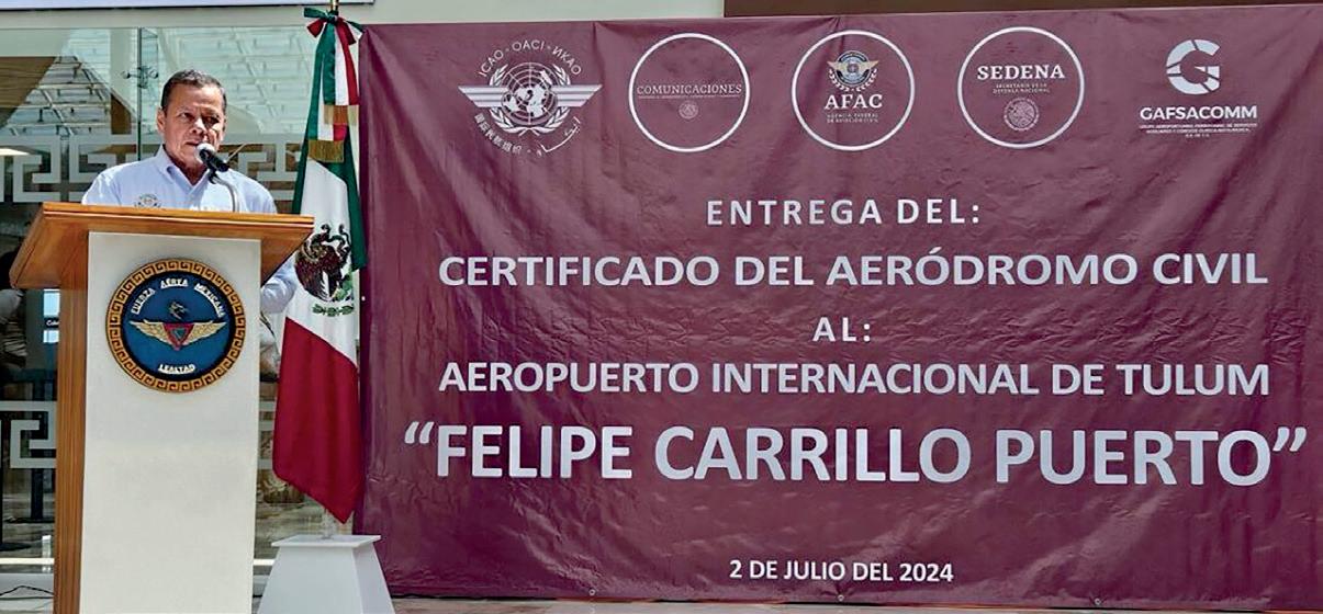 Durante la entrega del certificado, el administrador del Aeropuerto Internacional de Tulum, general Javier Diego Campillo, reiteró que desde la creación de la terminal aérea se está cumpliendo el objetivo de garantizar la seguridad y eficacia para satisfacer a los usuarios que lo utilizan.
