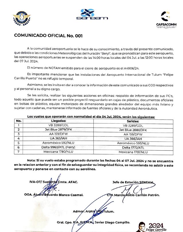 Debido a las condiciones meteorológicas por el huracán "Beryl'", que se pronostican para el Aeropuerto Internacional de Tulum, las operaciones se suspenden a partir de las 2 de la tarde de hoy hasta las 12 horas del domingo 7 de julio