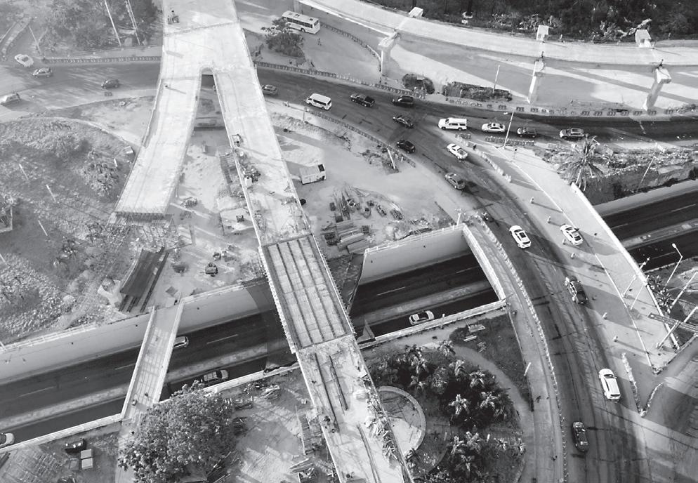 Trabajadores de la empresa Ingenieros Civiles Asociados (ICA), concentraron maquinaria y personal en el entronque del bulevar Colosio, que pasa por arriba de la glorieta de la antigua torre de control, que será el punto de intersección que conectará al puente con los carriles de entrada y salida hacia las principales avenidas del Centro de Cancún.