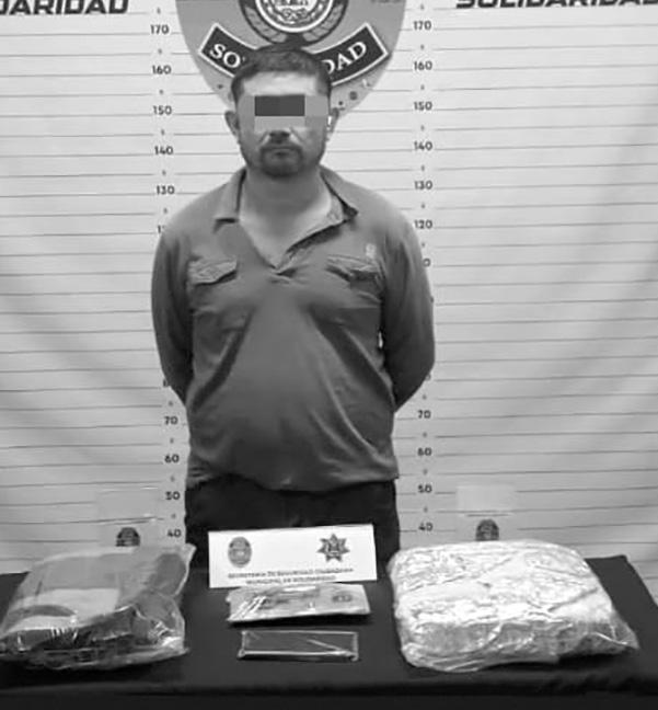 La Policía Municipal de Solidaridad aseguró a un sujeto, a una menor de edad, un arma de fuego, dos cartuchos útiles y posibles drogas en el fraccionamiento Villas del Sol.