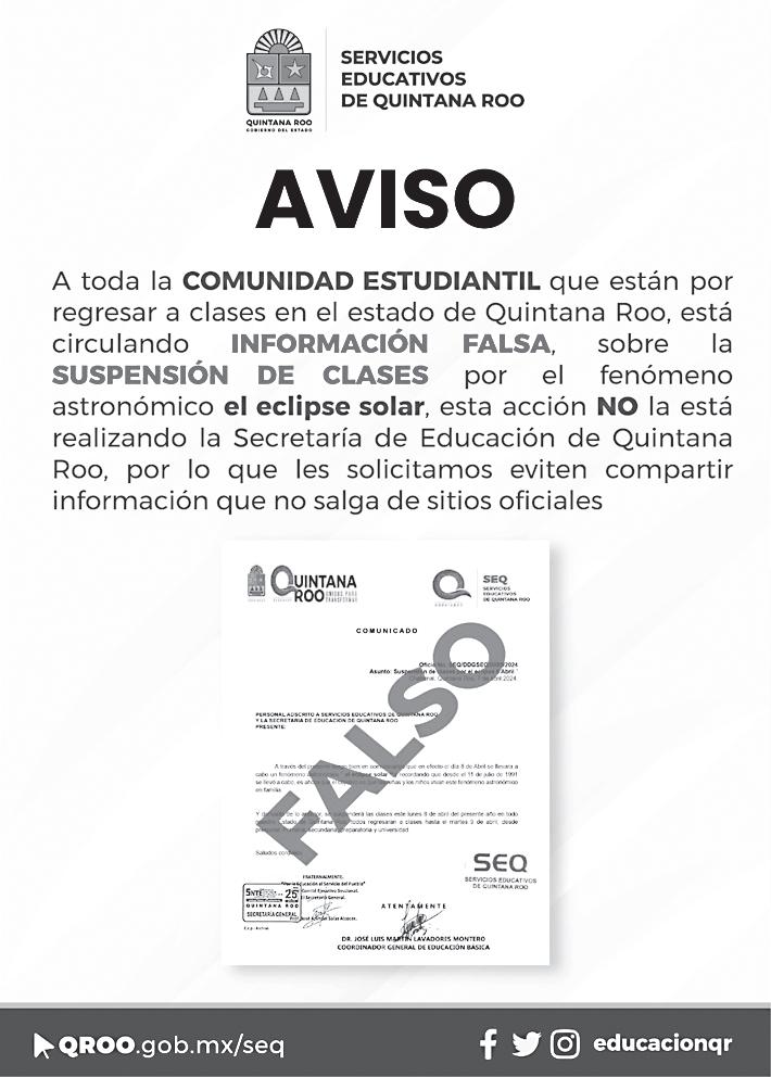 › La SEQ desmintió que emitiera un comunicado suspendiendo las clases, debido al eclipse solar de hoy.