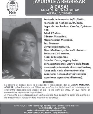 Activa la FGE búsqueda de Abisaí Mendoza Aguilar, visto por última vez en Cancún. Inf. al 9988817150 ext. 2130.