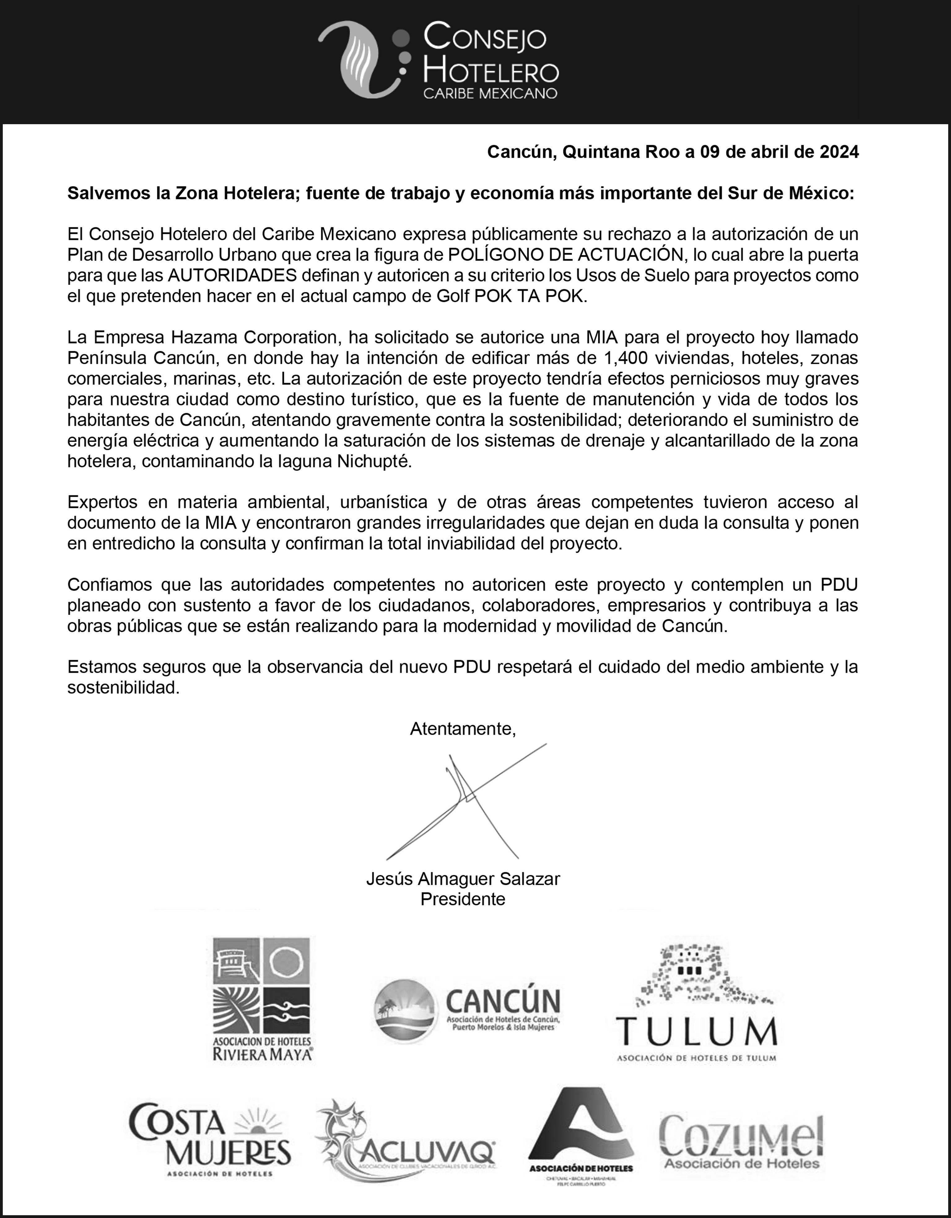 el proyecto, les hicimos ver el riesgo que se corre incrementando la densidad en Pok Ta Pok y alterando la demanda de servicios básicos como son el drenaje, agua potable, energía eléctrica, y la vialidad en el bulevar Kukulcán, y lo que implica para el principal destino turístico del país; les dejamos muy claro que no vamos a permitir que se afecte fuente”, declaró el líder de los hoteleros al terminar la reunión. Aclaró que los representantes del proyecto no tenían información completa y básicamente solo fueron a presentarse, por lo que se programó una segunda reunión, en donde ellos van a presentar las