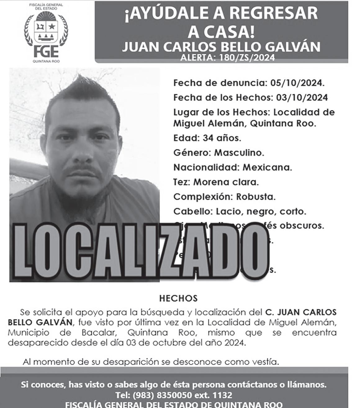 El localizado se identificó como Juan Carlos Bello Galván, quien contaba con ficha de búsqueda, tras denuncia por parte de sus familiares, el 5 de octubre del presente año; la fecha en que había sido visto por última vez fue el 3 de octubre.