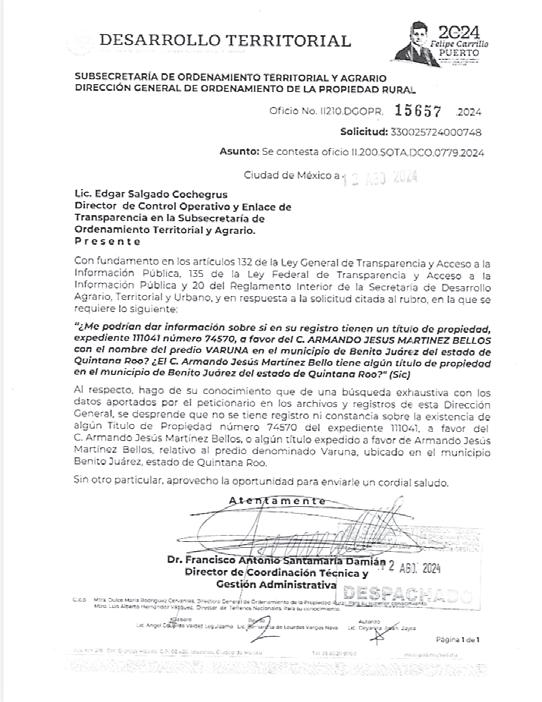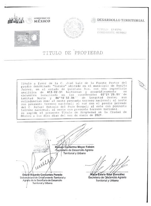 › En su momento, Sedatu advirtió sobre la existencia de un título de propiedad de un predio en Varuna a nombre de José Luis de la Fuente Pastor, que era falso.