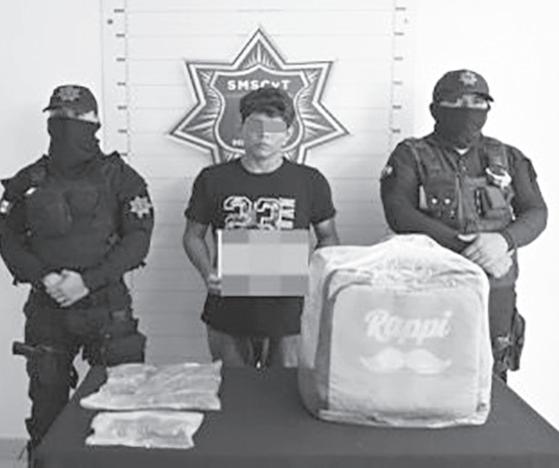 Un repartidor en moto de la aplicación Rappi, fue detenido por elementos de la Secretaría de Seguridad Ciudadana (SSC) en las inmediaciones de la Supermanzana 260, con 11 bolsas transparentes con hierba seca y verde, con carac-