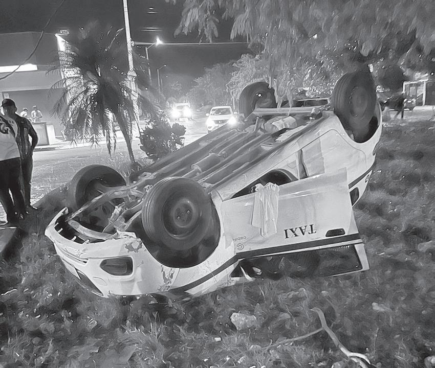 El taxi marca Chevrolet tipo Beat de color blanco con verde, con placas de circulación A475TRU del estado de Quintana Roo, marcado con el número 426 del sindicato de taxistas “Andrés Quintana Roo”, estaba con los neumáticos hacía arriba.