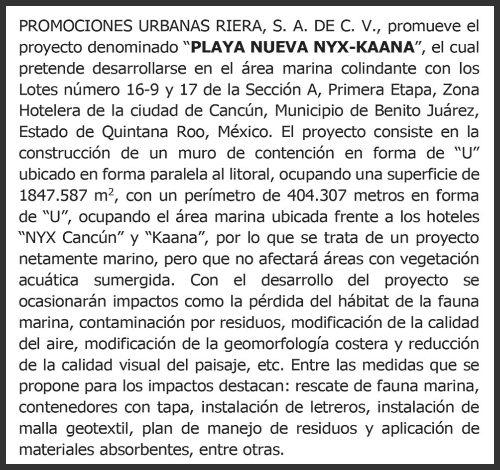 Al presentarse el proyecto, se informó de un tiempo de construcción estimado en 4 meses, con banda recolectora de sargazo, grúa para manejo de pesos de 2.6 tone-