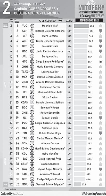 De acuerdo con el Ranking Mitofsky, siete mandatarios cayeron en número de gobernados satisfechos con su desempeño respecto de agosto: tres de Morena, dos del PAN, uno del PVEM y otro de MC; mientras que 24 subieron: 19 morenistas, dos panistas, dos priistas y un emecista; y solo uno se mantuvo igual, del PAN.