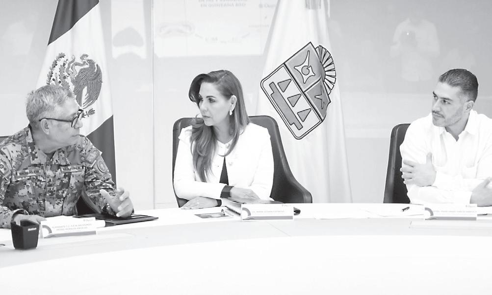 La gobernadora Mara Lezama Espinosa encabezó ayer una reunión de trabajo donde el secretario de Seguridad y Protección Ciudadana del Gobierno de México, Omar García Harfuch, y el secretario de Marina, almirante C.G.D.E.M. Raymundo Pedro Morales Ángeles, presentaron la Estrategia Nacional de Seguridad a las y los quintanarroenses.