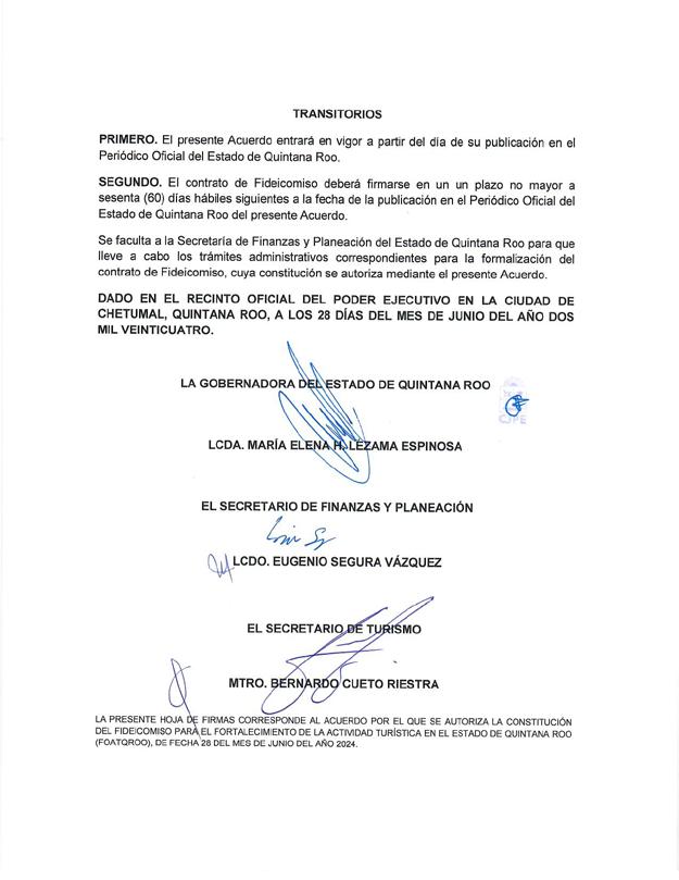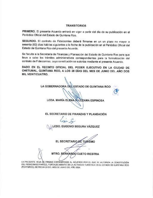 El acuerdo publicado en el Periódico Oficial del Estado fue firmado por la gobernadora; Eugenio Segura Vázquez, secretario de Finanzas y Planeación y Bernardo Cueto Riestra, secretario de Turismo.