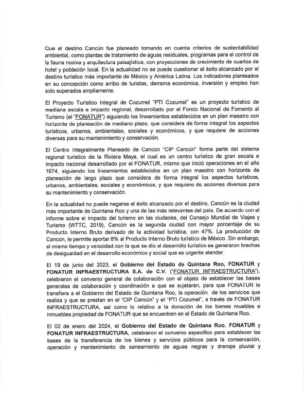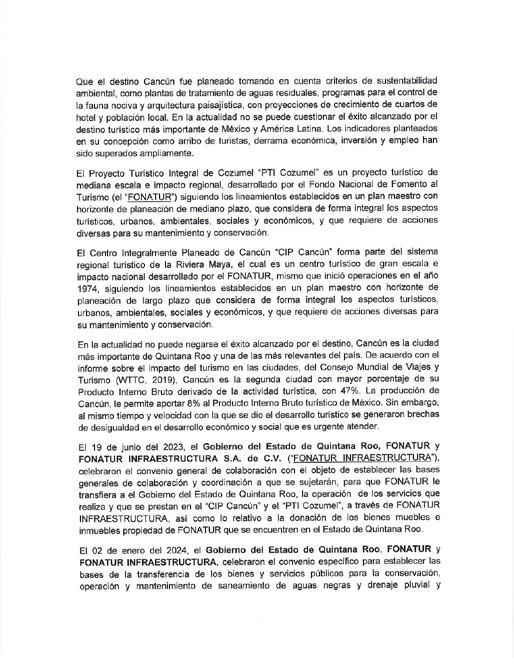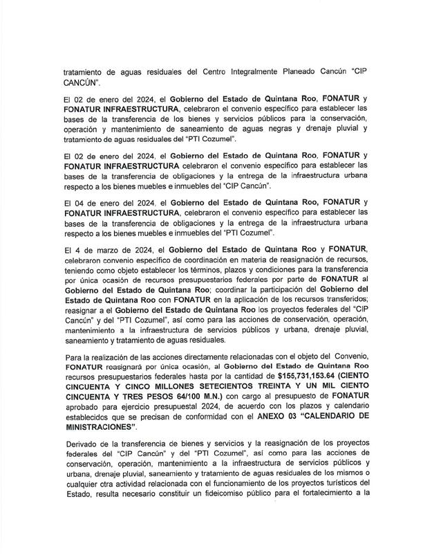 Cabe recordar que el 19 de junio de 2023 el gobierno del estado, Fonatur y Fonatur Infraestructura celebraron un convenio general de colaboración con el objetivo de establecer las bases para que Fonatur le transfiriera al Gobierno del Estado la operación de los servicios, así como lo relativo a la donación de los bienes muebles e inmuebles, propiedad de Fonatur que se encuentran en Quintana Roo; y el 2 de enero celebraron el convenio en específico para establecer las bases de la transferencia de los bienes y servicios públicos para la conservación operación y mantenimiento de saneamiento de aguas negras y drenaje pluvial y tratamiento de aguas residuales del Centro Integralmente Planeado (CIP) Cancún.