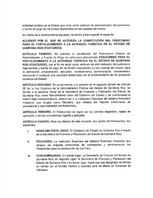 Lo anterior, mediante un acuerdo en el que se autoriza la constitución de éste, publicado en el Periódico Oficial del Estado, que tendrá como fin servir como vehículo de administración del patrimonio fideicomitido y fuente de pago de los fondos depositados en las cuentas de este; para la planeación, programación, ejecución, mantenimiento, administración, conservación, evaluación o cualquier otra actividad relacionada con el funcionamiento de los proyectos turísticos del estado.