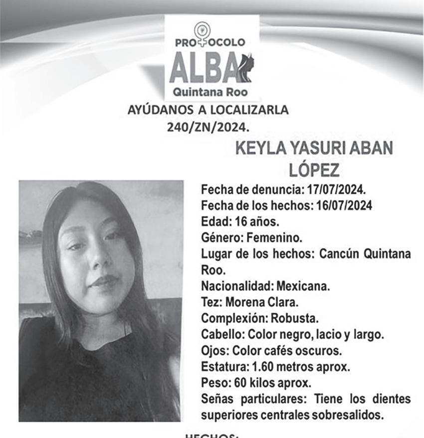 persona que tenga información sobre su paradero que se comunique al 998 881 7150 ext. 2130. Además, se han emitido fichas de búsqueda para dos personas más desaparecidas en Benito Juárez el 16 de julio de 2024. José Ramón Aban Vázquez y Keyla Yasuri Aban López son las personas en cuestión. Cualquier dato sobre su paradero puede ser proporcionado a través del mismo número de contacto: 998 881 7150 ext. 2130.