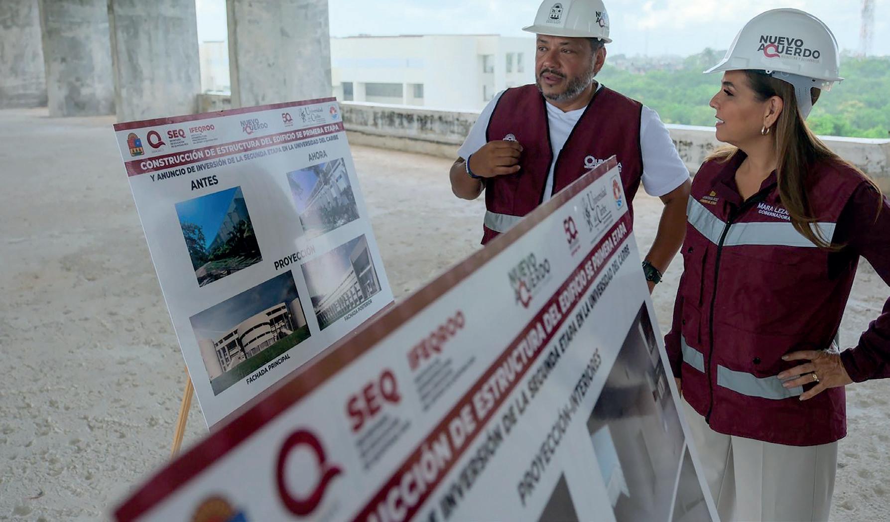 La gobernadora Mara Lezama Espinosa recorrió la Universidad del Caribe para supervisar la primera etapa de la construcción del tercer nivel del edificio “E”, con una inversión de 26.5 millones de pesos, y anunció 21.5 millones adicionales para iniciar la segunda etapa en septiembre y concluirla en diciembre de este mismo año.