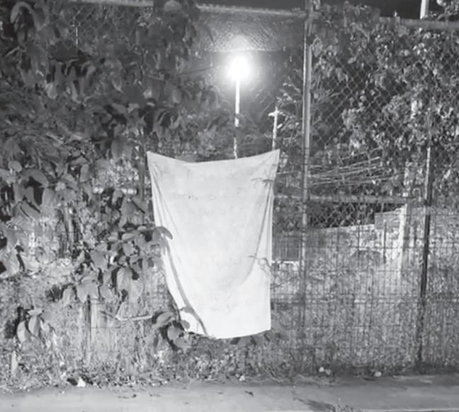 › La Policía aseguró y descolgó la narcomanta en una cancha deportiva.