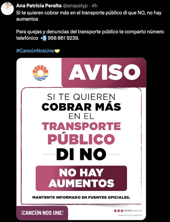 Ana Patricia Peralta de la Peña, presidenta municipal de Benito Juárez, aseguró que el ayuntamiento no ha autorizado incremento alguno en el transporte urbano de pasajeros e informó que mediante operativos implementados por la Dirección de Transporte y Vialidad fueron retirados 90 anuncios de notificaciones de aumento en unidades, para asegurar que se respete la tarifa vigente del transporte público.