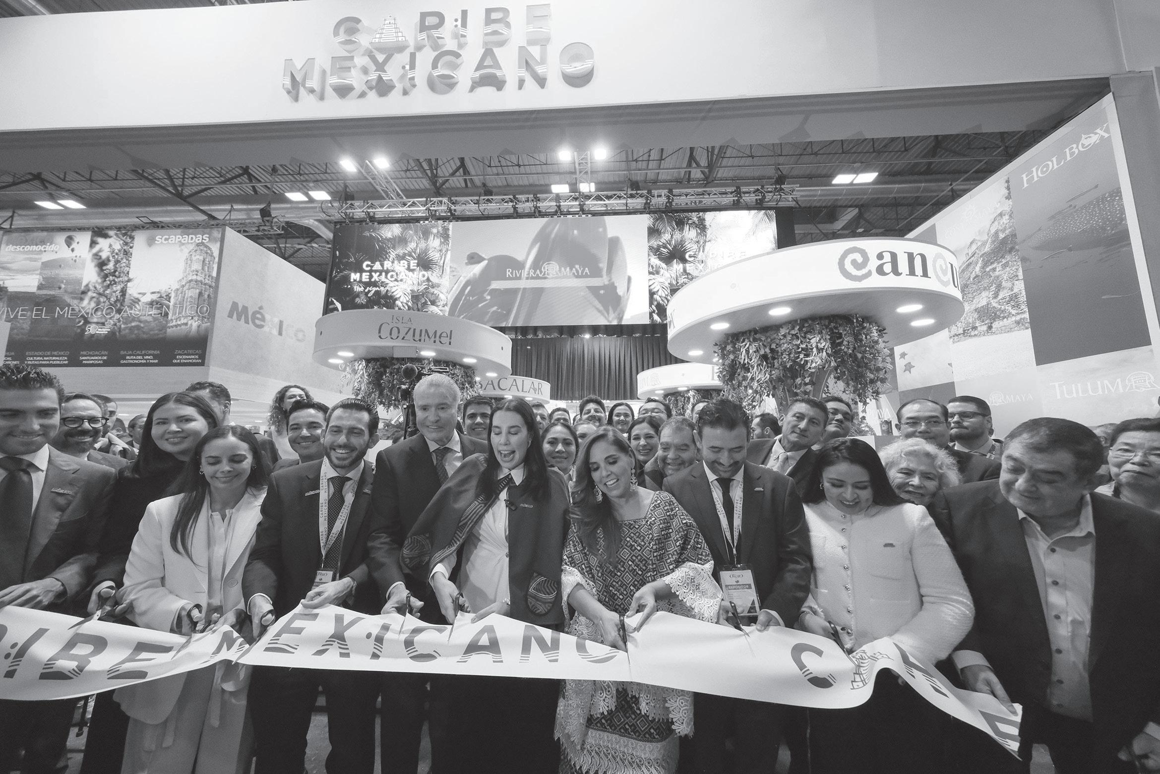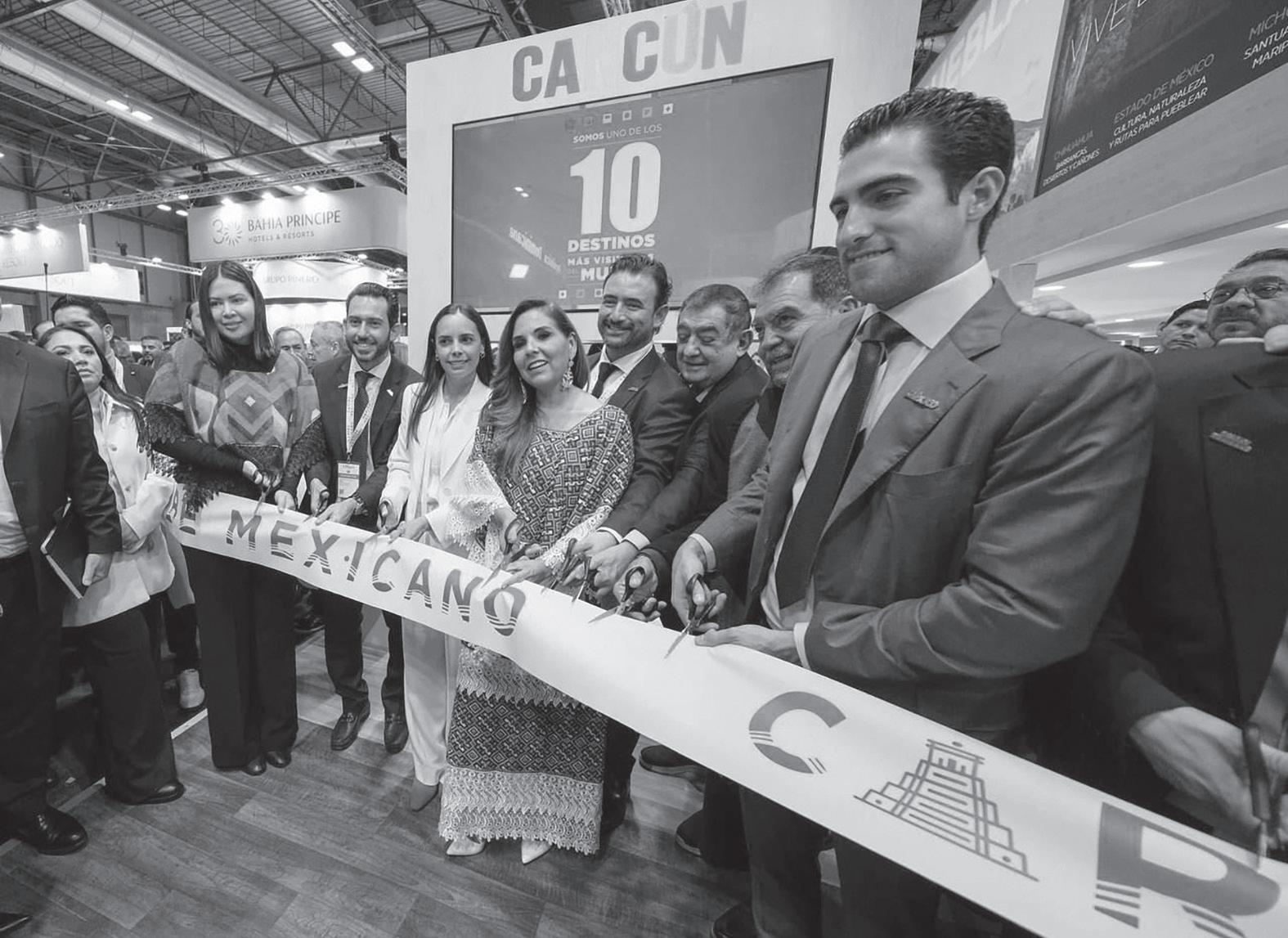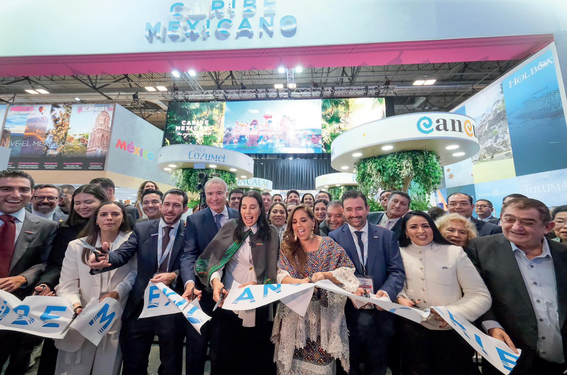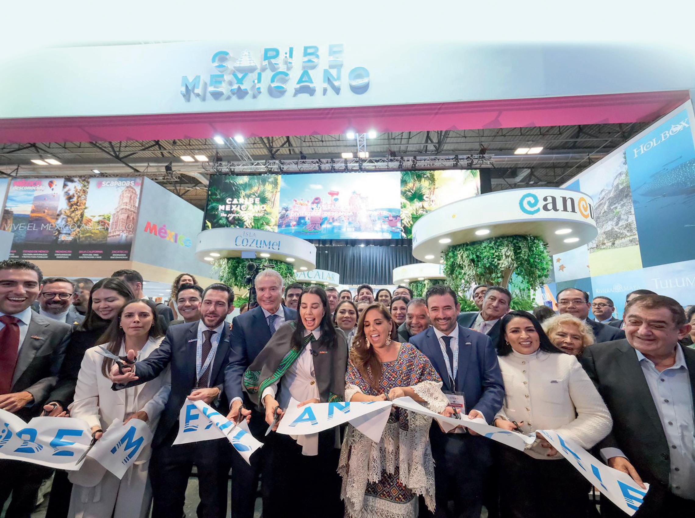 Maya, la gobernadora Mara Lezama Espinosa, acompañada por la secretaria federal de Turismo, Josefina Rodríguez Zamora, e integrantes de la delegación quintanarroense, cortó el listón inaugural del pabellón del Caribe Mexicano,