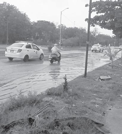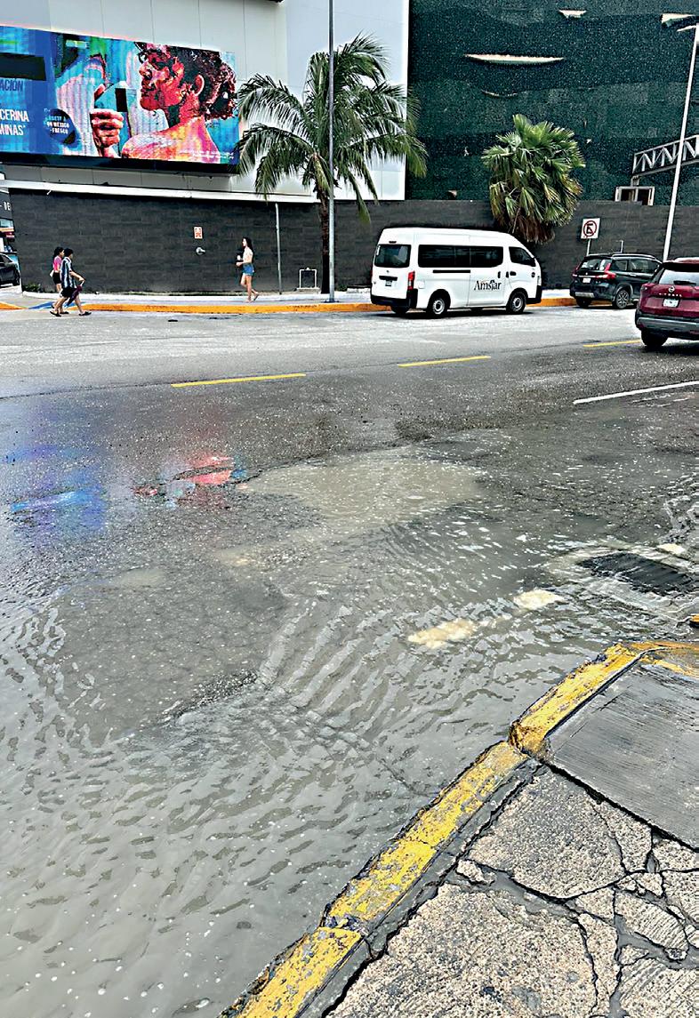 ATRÁS DE CHEDRAUI SELECTO, EL AGUA CUBRE UN GRAN BACHE, lo que representa un peligro para la circulación.