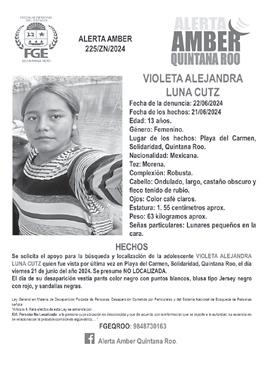 Activa la FGE búsqueda de Violeta Alejandra Luna Cutz, vista por última vez en Solidaridad. Inf. al 984 873 0163.