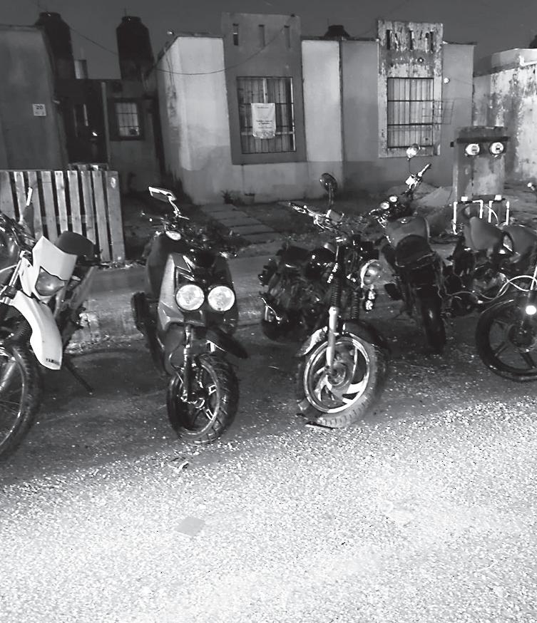cializada en Combate a Robo de Vehículos y Transporte, aseguraron dos motocicletas y dos cuadros pertenecientes a motocicletas con reporte de robo en la entidad. Asimismo, recuperaron ocho motocicletas y un mototaxi, los cuales no cuentan con reporte de robo, sin embargo, los números de identificación tienen presuntas alteraciones, por lo que llevarán a cabo la investigación correspondiente. Al concluir la diligencia, los agentes procedieron a colocar los sellos para indicar que el lugar quedó asegurado, en tanto que las evidencias recabadas fueron puestas a disposición de la autoridad correspondiente.