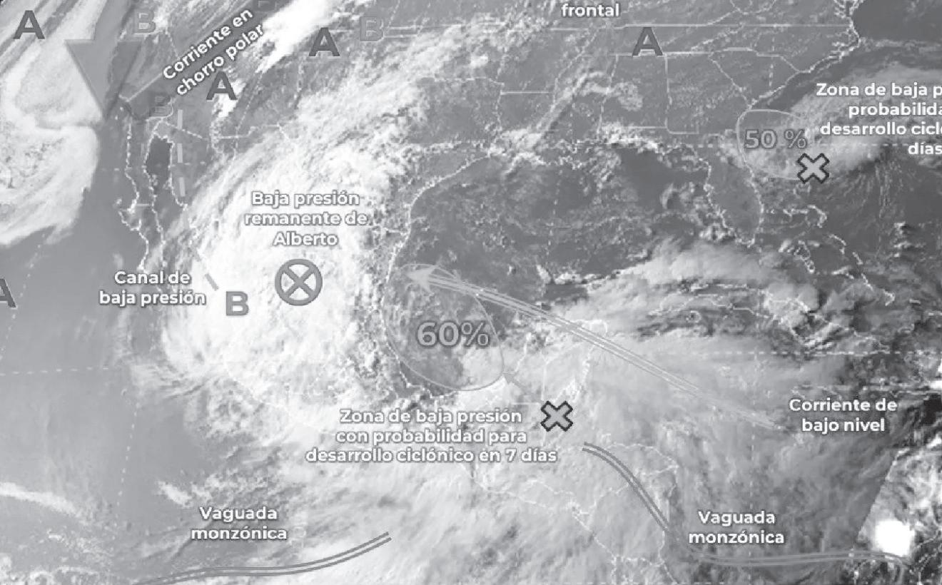 “Un sistema de baja presión que puede evolucionar a un ciclón tropical durante el fin de semana estaría ubicado al sur de la península de Yucatán”, aseguró Alejandra Margarita Méndez Girón, coordinadora general del Servicio Meteorológico Nacional (SMN). Al día de hoy el SMN mantiene vigilada la zona de baja presión con probabilidad para de-