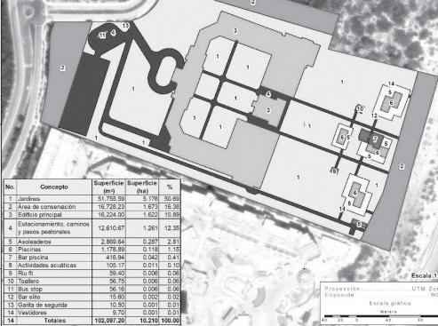 elite, área de actividades acuáticas, riu fit, toallero, bus stop, garita de seguridad y vestidores. Se pretende desarrollar dentro de una superficie total de 102,097.20 metros cuadrados (10.210 ha).